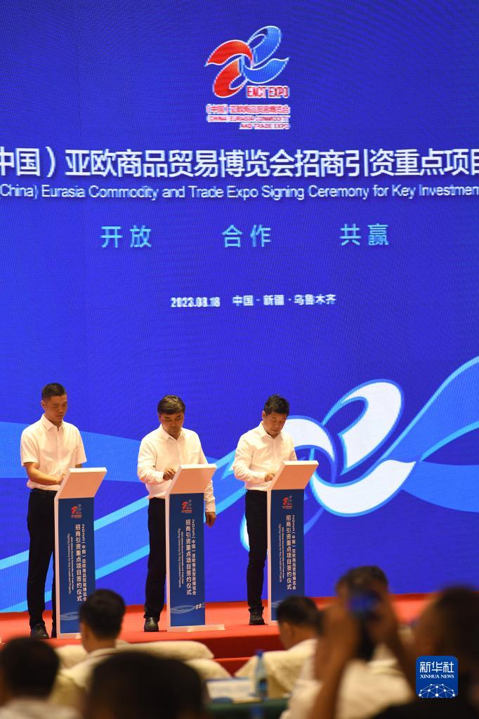 8月18日下午,2023(中國)亞歐商品貿易博覽會舉行招商引資重點項目簽約儀式。本屆商博會征集簽約項目273個,簽約總額4932.12億元,其中,一期計劃投資1470億元,涉及新能源新材料、有色金屬、煤化工、紡織服裝、裝備制造、商貿物流、文化旅游等多個領域。