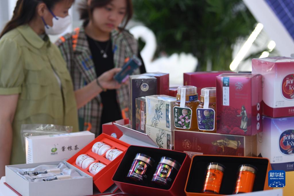 8月18日,在2023(中國)亞歐商品貿易博覽會上,市民在挑選產自新疆尉犁縣的羅布麻系列產品。