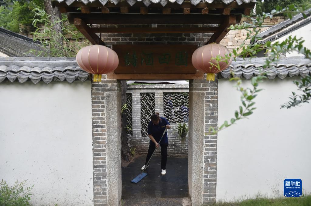8月17日,在汝州市大峪鎮袁窯村,云堡妙境民宿的工作人員在清潔地面。