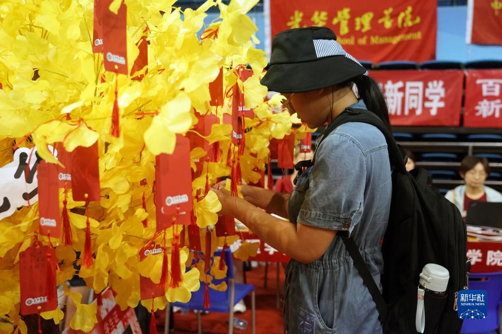 8月19日,在北京大學邱德拔體育館,一名光華管理學院的2023級本科新生將祝福語掛在“簽到樹”上。
