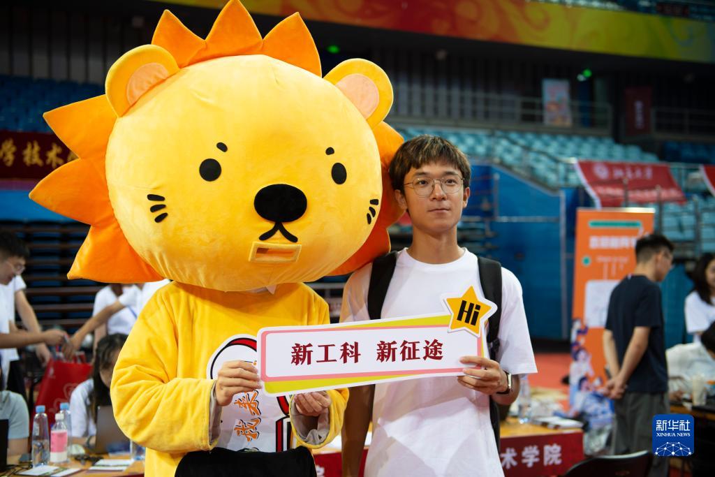 8月19日,在北京大學(xué)邱德拔體育館,一名新生在報到現(xiàn)場拍照留念。