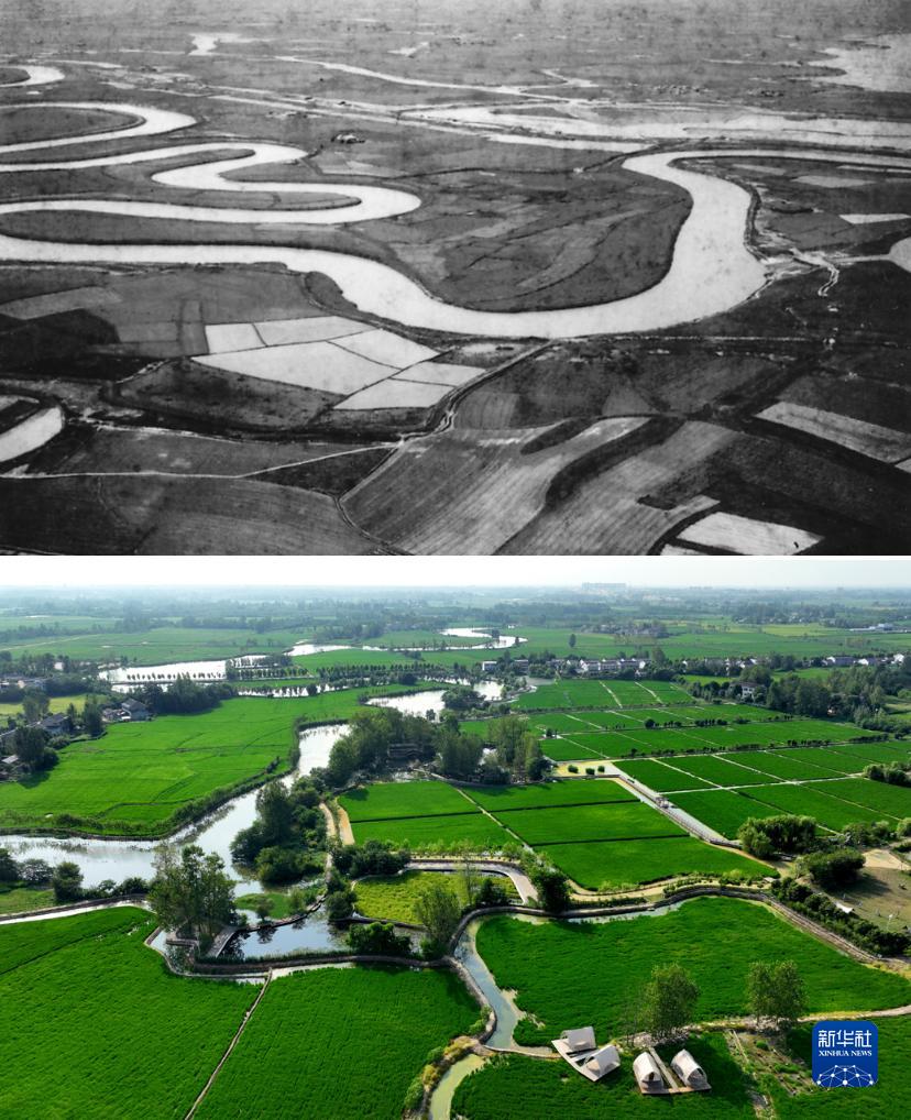 這是一張拼版照片。上圖為:1965年拍攝的位于安徽省六安市的淠史杭灌區良田(新華社發 田準攝);下圖為:2023年8月18日拍攝的淠史杭灌區良田(無人機照片,新華社發 陳力攝)。