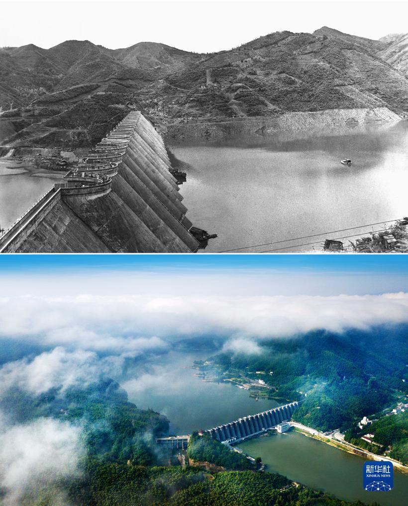 這是一張拼版照片。上圖為:拍攝的位于安徽省六安市金寨縣的佛子嶺水庫(資料照片,新華社發 樓并銓攝);下圖為:2021年8月8日拍攝的佛子嶺水庫(無人機照片,新華社發 蔣常虹攝)。