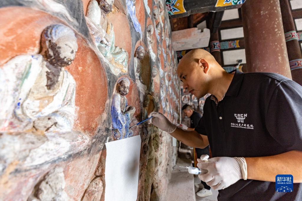 8月19日,在大足石刻小佛灣摩崖造像保護工程現場,工作人員對石刻造像病害進行處理。