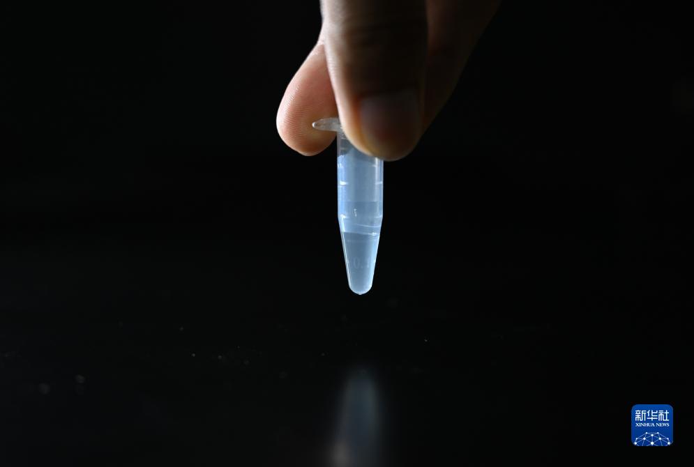 在中國科學院天津工業生物技術研究所實驗室拍攝的一份人工合成己糖溶液樣品(8月13日攝)。