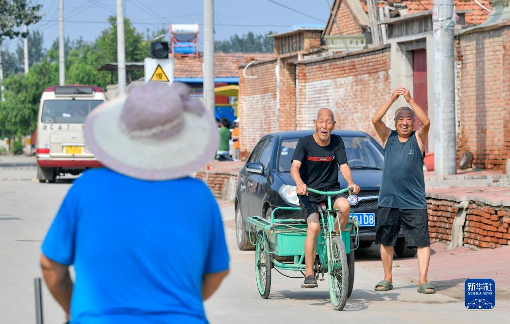 8月17日,在天津市武清區黃花店鎮邵七堤村,返村村民相互問候打招呼。
