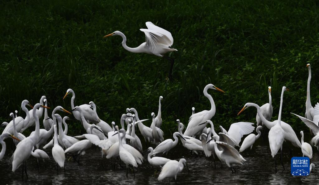 近日,成群的白鷺在山東省滕州市荊河水域覓食、飛舞。
