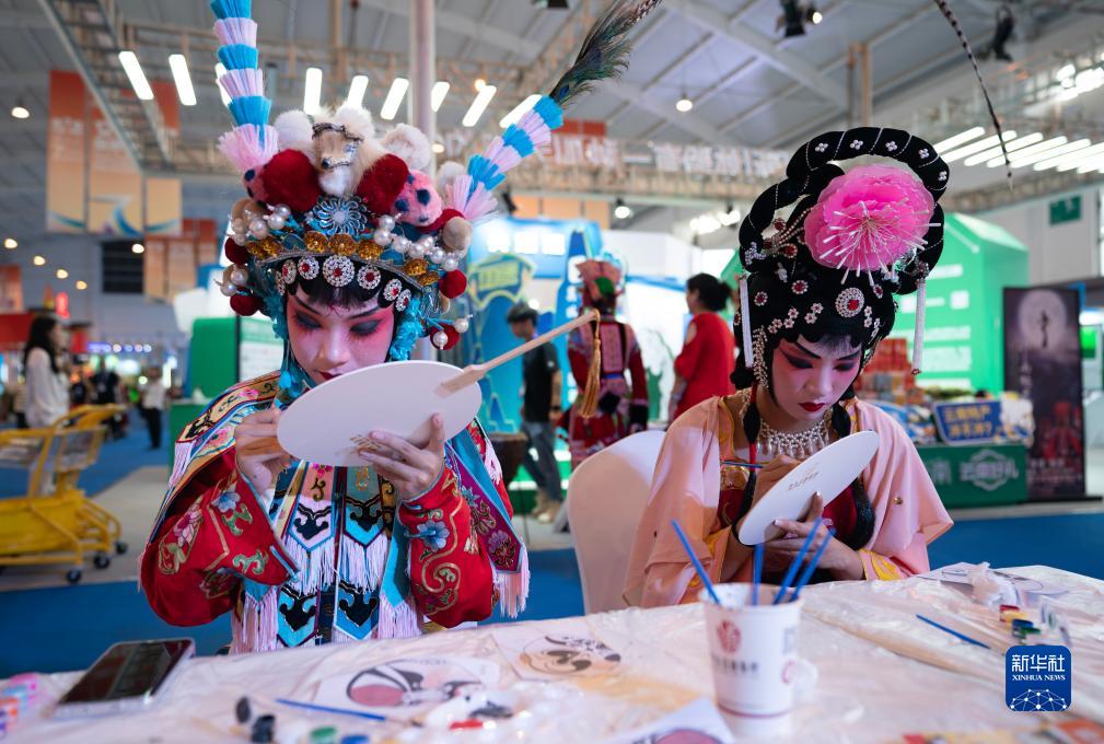 8月16日,在南博會文化旅游館滇劇展演區,兩名來自云南省滇劇院的演員在扇子上繪制臉譜。
