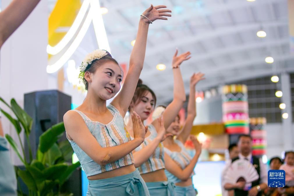 8月18日,演員在文化旅游館內的德宏展位表演傣族舞蹈。