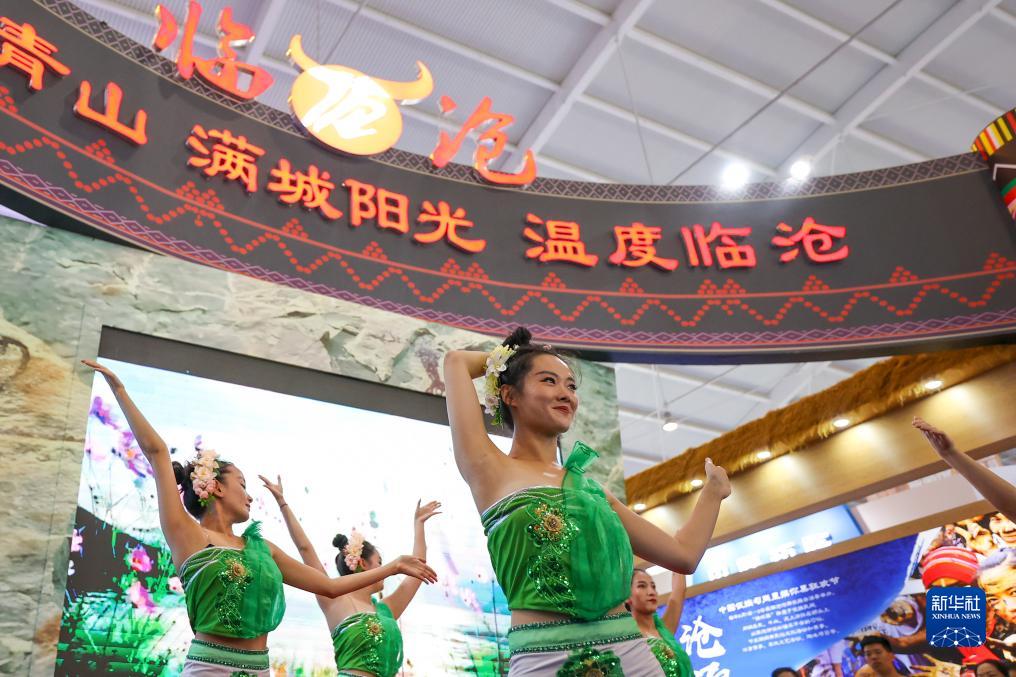 8月18日,演員在文化旅游館內的臨滄展區表演傣族舞蹈。