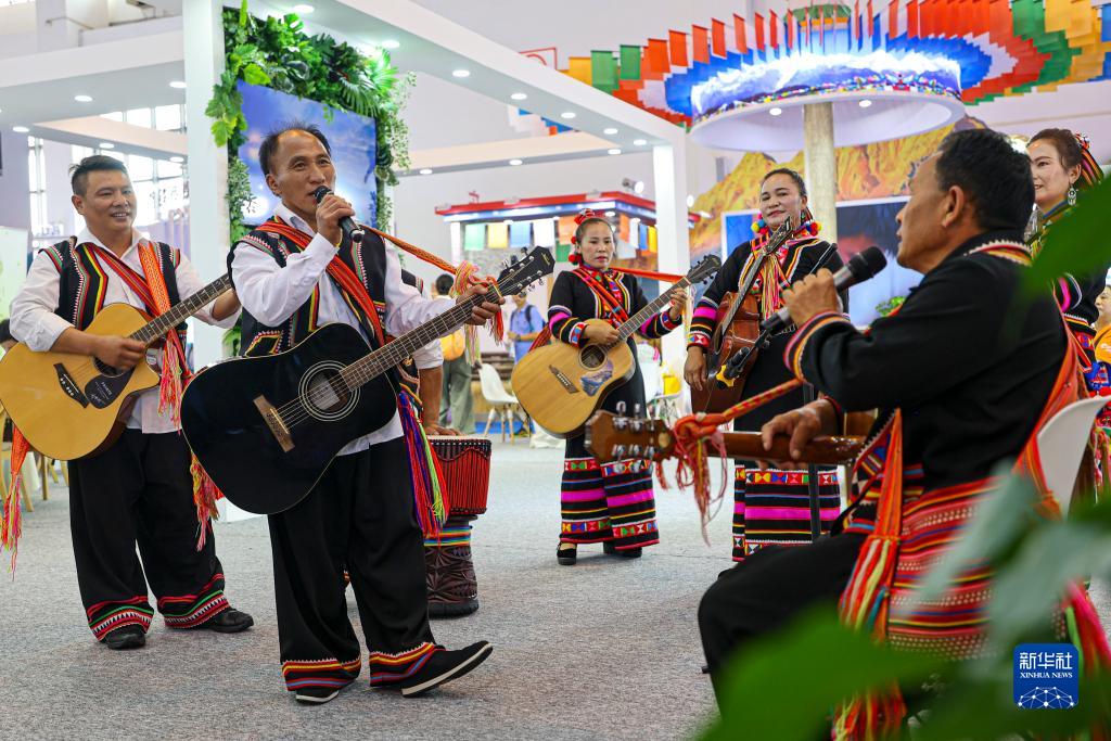 8月18日,演員在文化旅游館內的普洱展區表演傳統歌曲。