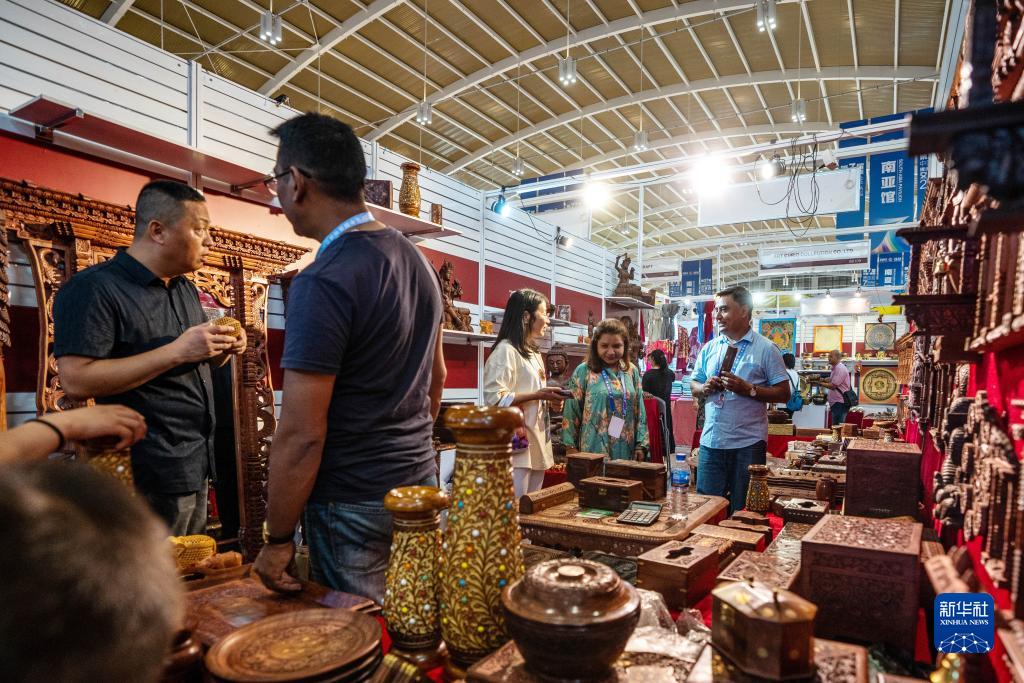 8月18日,參觀者在第七屆中國(guó)—南亞博覽會(huì)尼泊爾展區(qū)參觀、選購(gòu)商品。