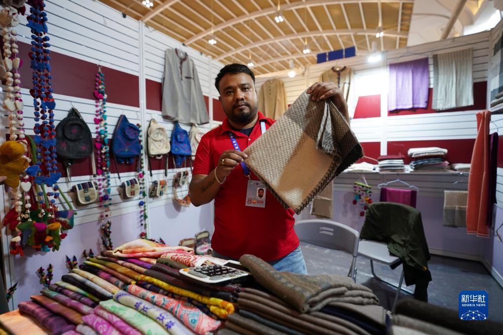 在第七屆中國—南亞博覽會上,一名來自尼泊爾的展商在展示圍巾(8月18日攝)。