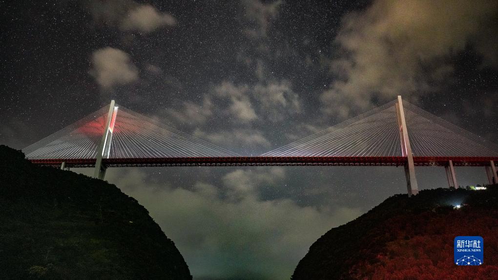 從馬選軍家陽臺拍攝的杭瑞高速北盤江大橋夜景(8月16日攝)。