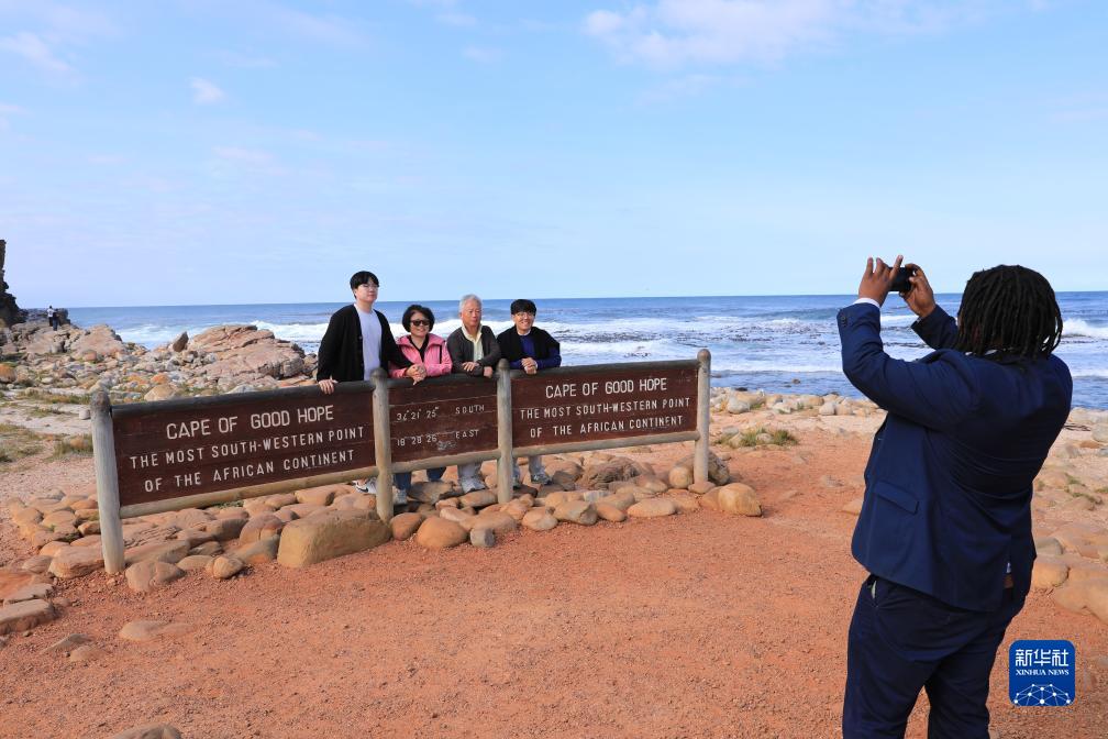 8月12日,游客在南非開普敦好望角合影。