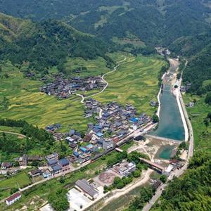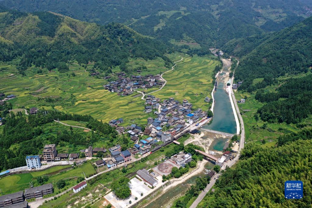 融水苗族自治縣香粉鄉雨卜村整治后的河道、村莊、旅游設施等(8月19日攝,無人機照片)。近年來,雨卜村充分利用粵桂協作幫扶資金,通過整治河道、修繕古建筑等,發展鄉村旅游產業,打造鄉村旅游示范村。