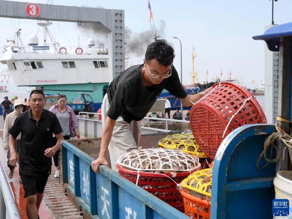 8月16日,商戶在浙江省舟山市普陀區舟山國際水產城運送剛從漁船上卸下的梭子蟹。新華社記者 翁忻旸 攝