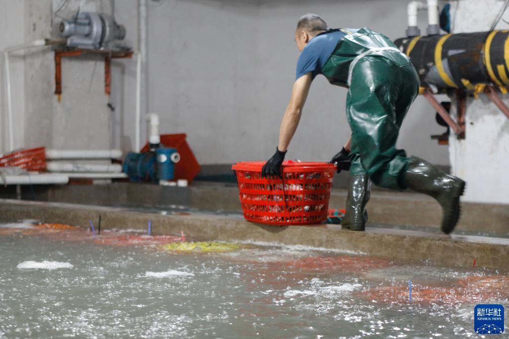 8月16日,工作人員將剛到港的梭子蟹轉運至浙江省舟山市普陀區舟山國際水產城商戶的暫養池。新華社記者 劉夢琪 攝