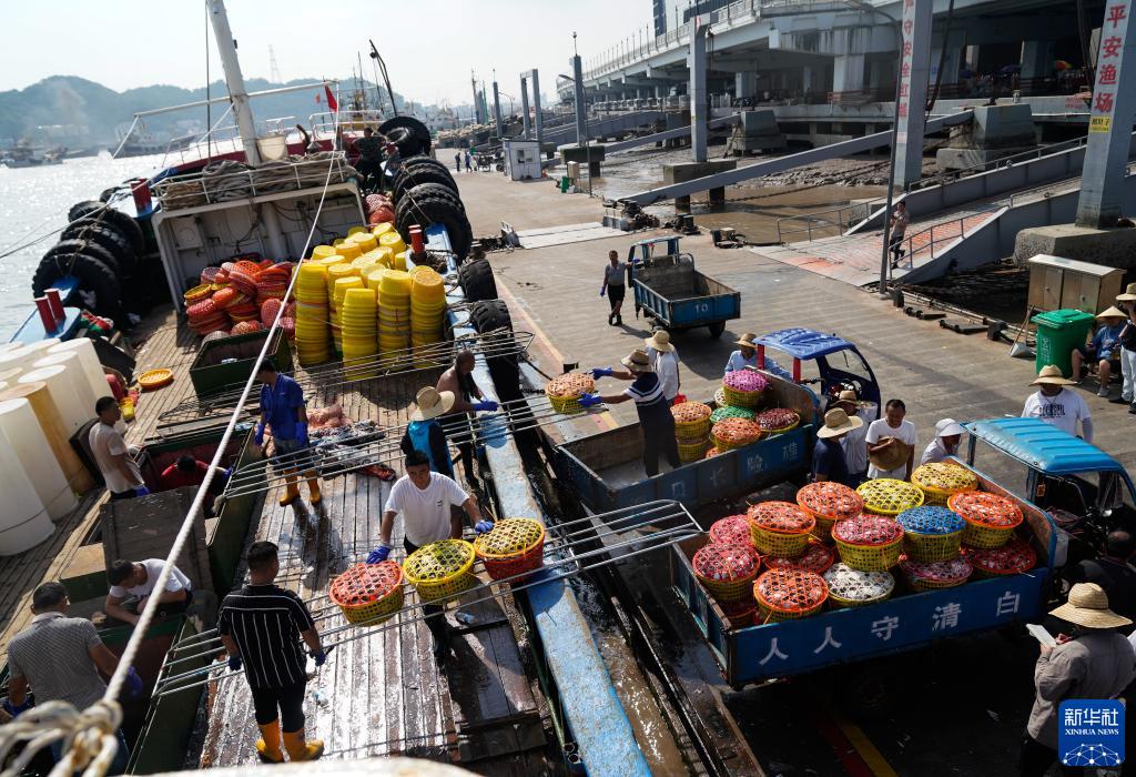 8月16日,在浙江省舟山市普陀區(qū)舟山國際水產(chǎn)城碼頭,工作人員從漁運船上卸下新鮮梭子蟹。新華社記者 韓傳號 攝