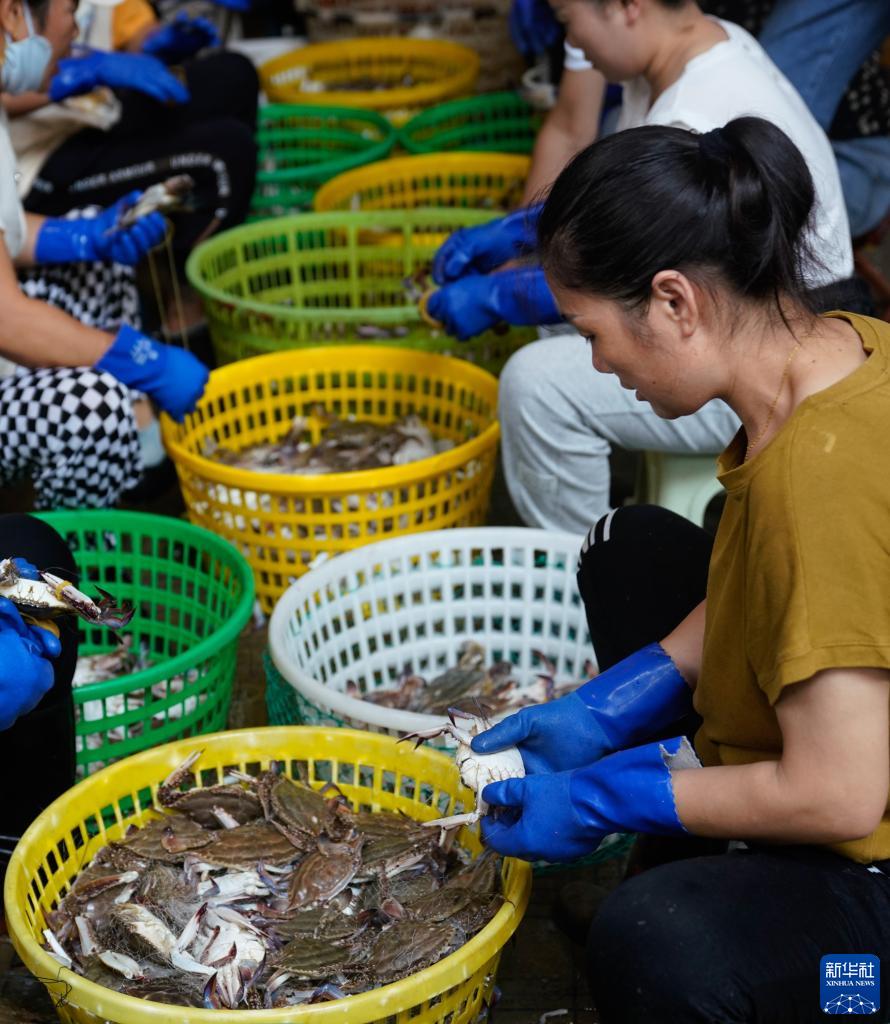 8月17日,在浙江省舟山市普陀區舟山國際水產城,工作人員按級分揀梭子蟹。新華社記者 韓傳號 攝
