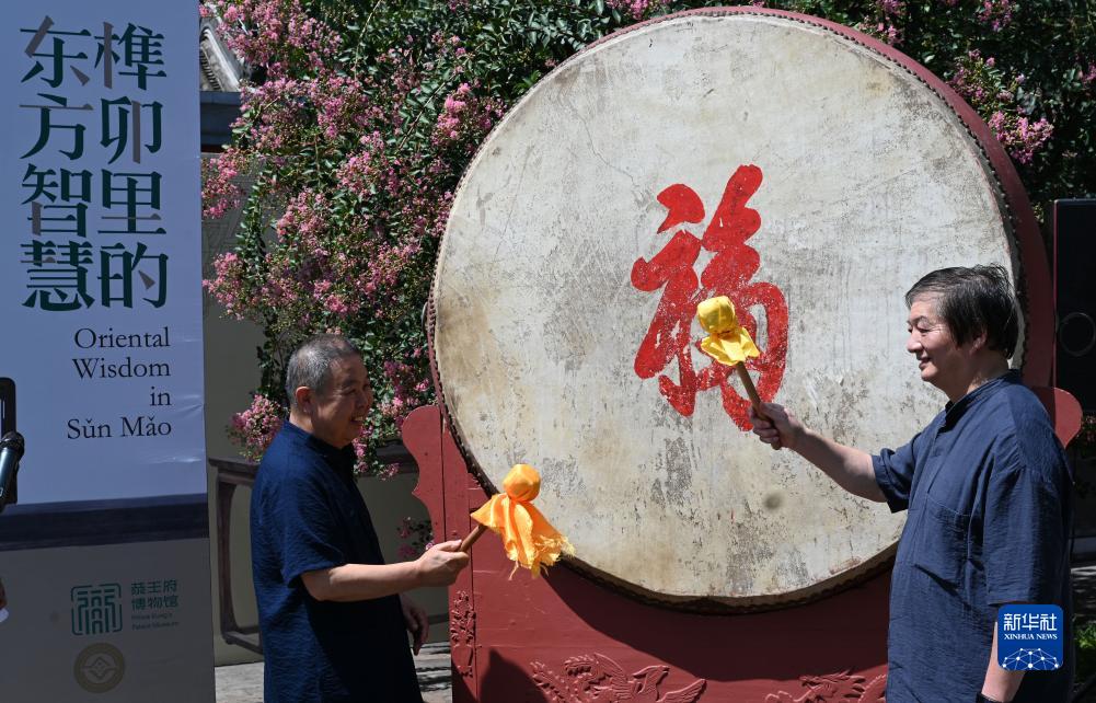 8月21日,京作硬木家具制作技藝國(guó)家級(jí)代表性傳承人種桂友(左)、明式家具制作技藝國(guó)家級(jí)代表性傳承人許建平共同為展覽擊鼓開(kāi)幕。