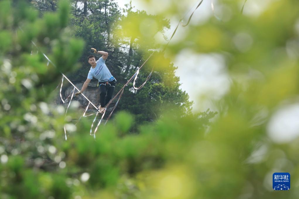 8月21日,2023年張家界黃石寨高空扁帶賽在湖南張家界國家森林公園黃石寨舉行。來自中國、法國、西班牙等國家和地區的選手在峰林之間競技。