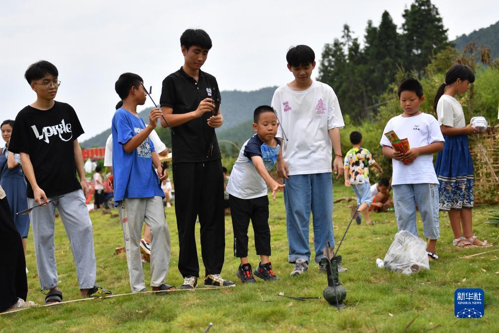 8月20日,孩子們在2023大元社鄉村青少年藝術節中體驗投壺游戲。