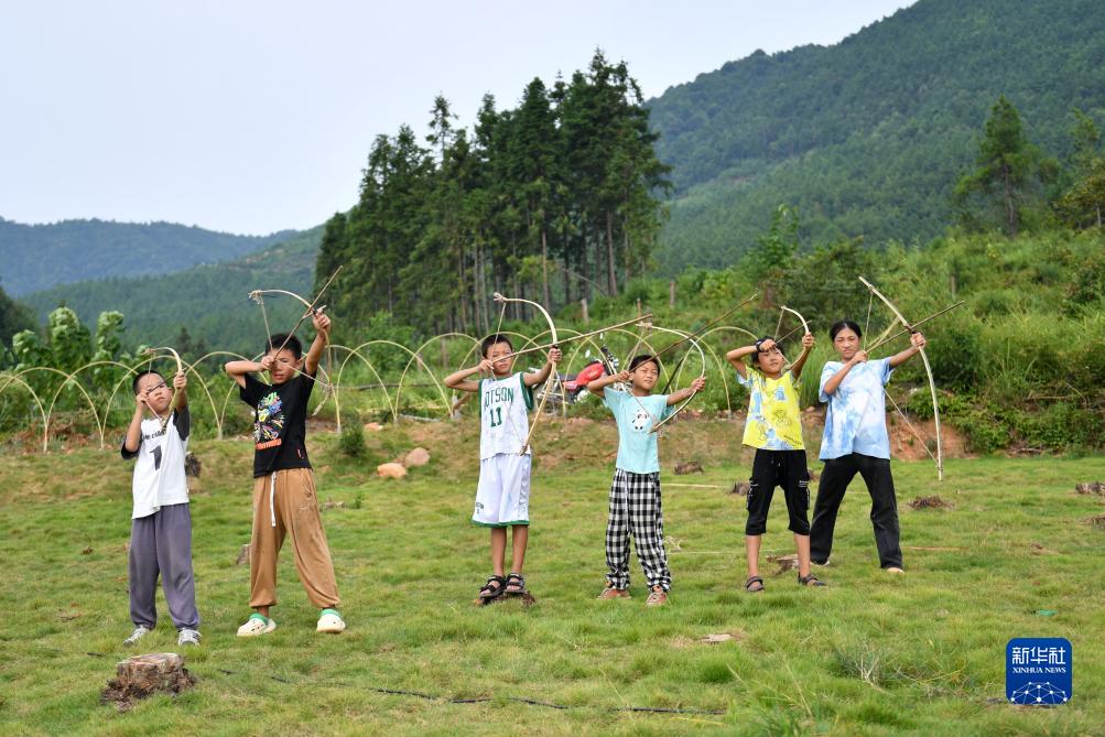 8月19日,孩子們在玩耍自己制作的玩具弓箭。