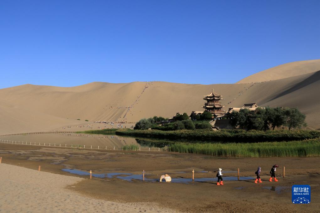 初秋時節,甘肅省敦煌市碧空如洗,鳴沙山月牙泉景區景色如畫,引人入勝。