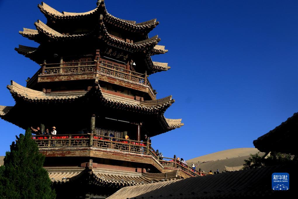 初秋時節,甘肅省敦煌市碧空如洗,鳴沙山月牙泉景區景色如畫,引人入勝。