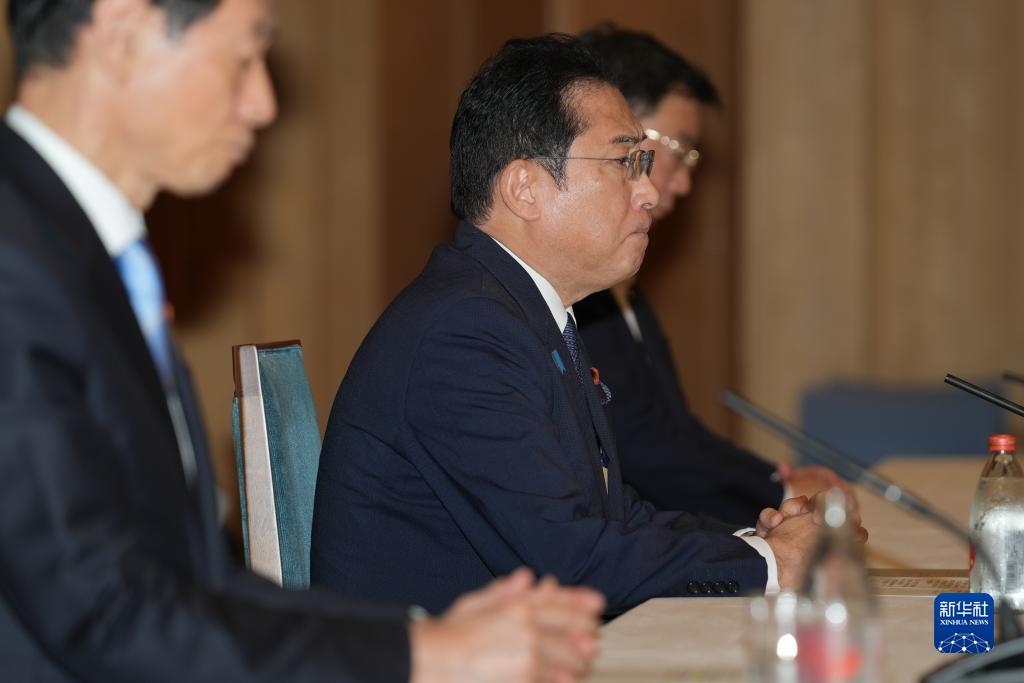8月21日,在日本東京首相官邸,日本首相岸田文雄(中)會見日本全國漁業協會聯合會會長坂本雅信一行。