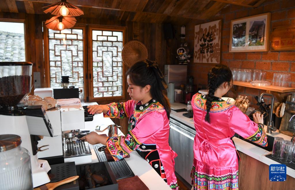 8月20日,酉陽縣花田鄉何家巖村一家咖啡廳的工作人員在準備飲品。