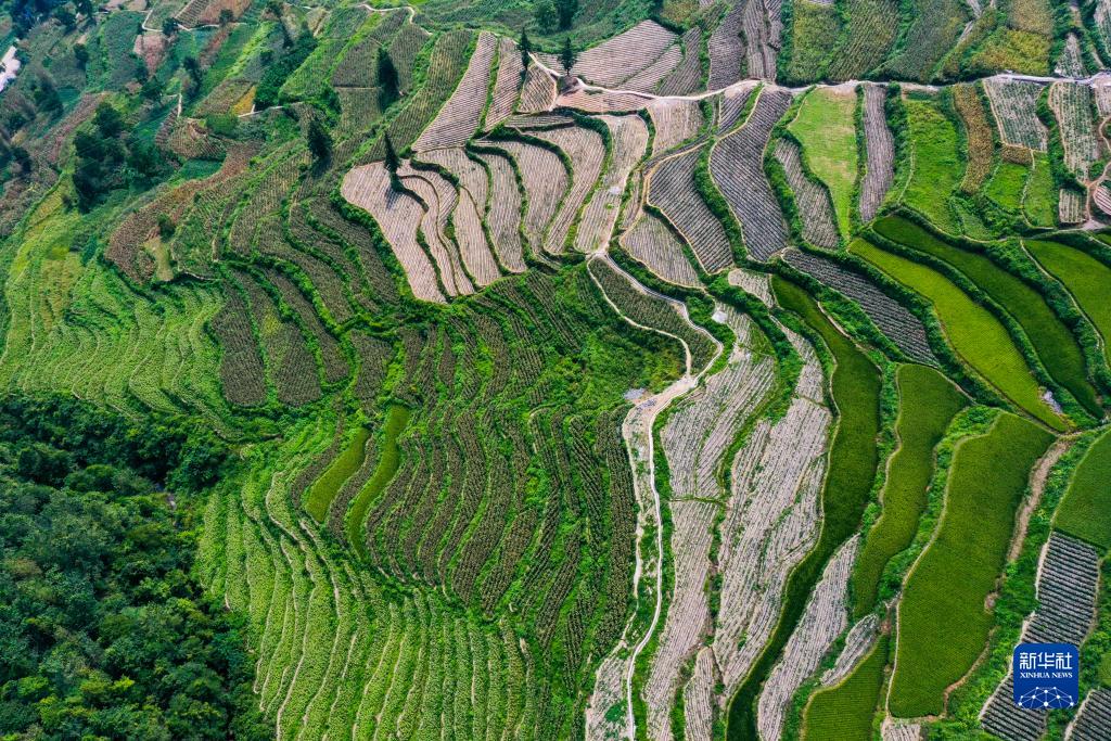 8月19日拍攝的酉陽縣丁市鎮(zhèn)中壩村梯田景觀(無人機(jī)照片)。
