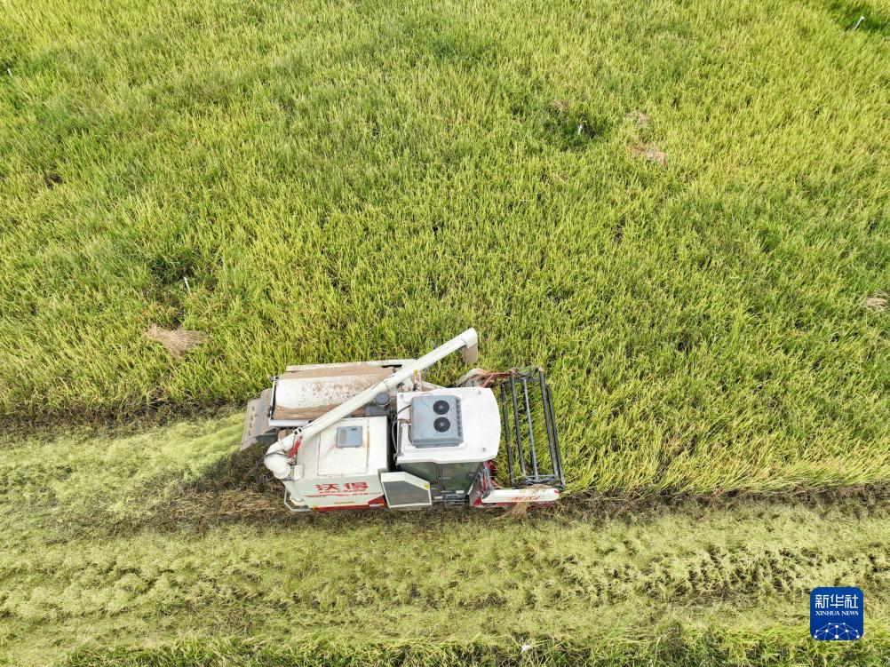 8月22日,在湖南省永州市道縣清塘鎮(zhèn)樓田村,農(nóng)民駕駛機(jī)械收割水稻(無(wú)人機(jī)照片)。