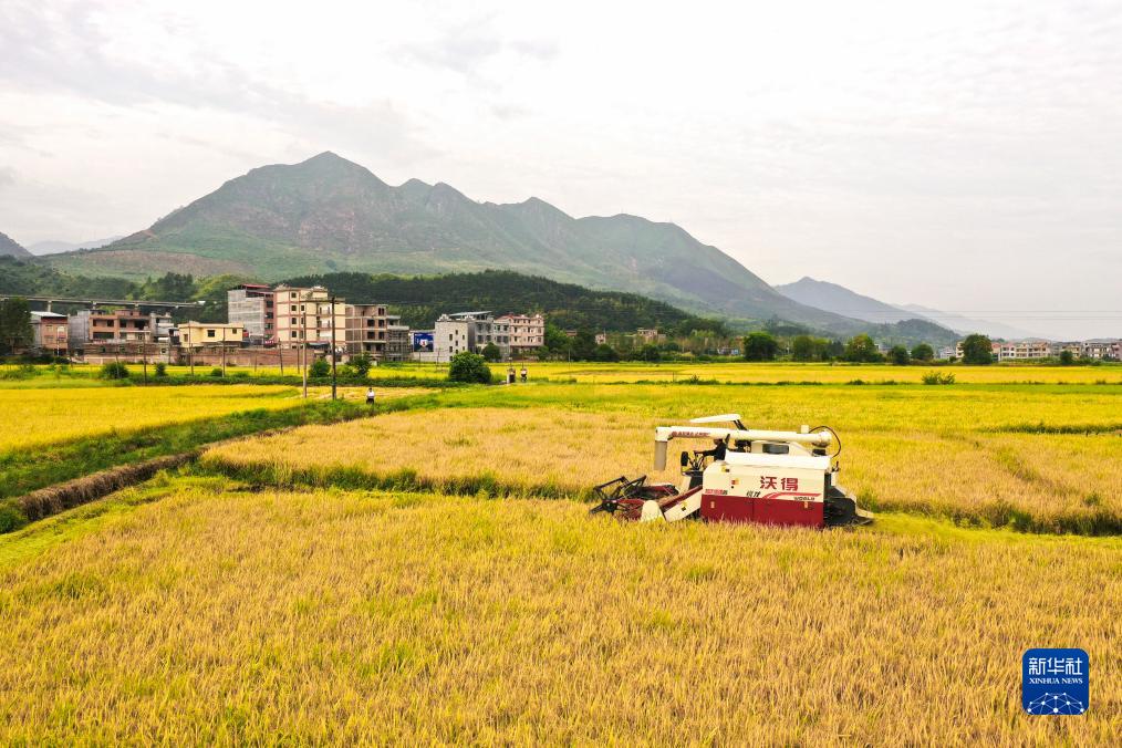 8月21日,湖南省常寧市廟前鎮(zhèn)泉井村農(nóng)民駕駛農(nóng)機(jī)在收獲水稻(無(wú)人機(jī)照片)。