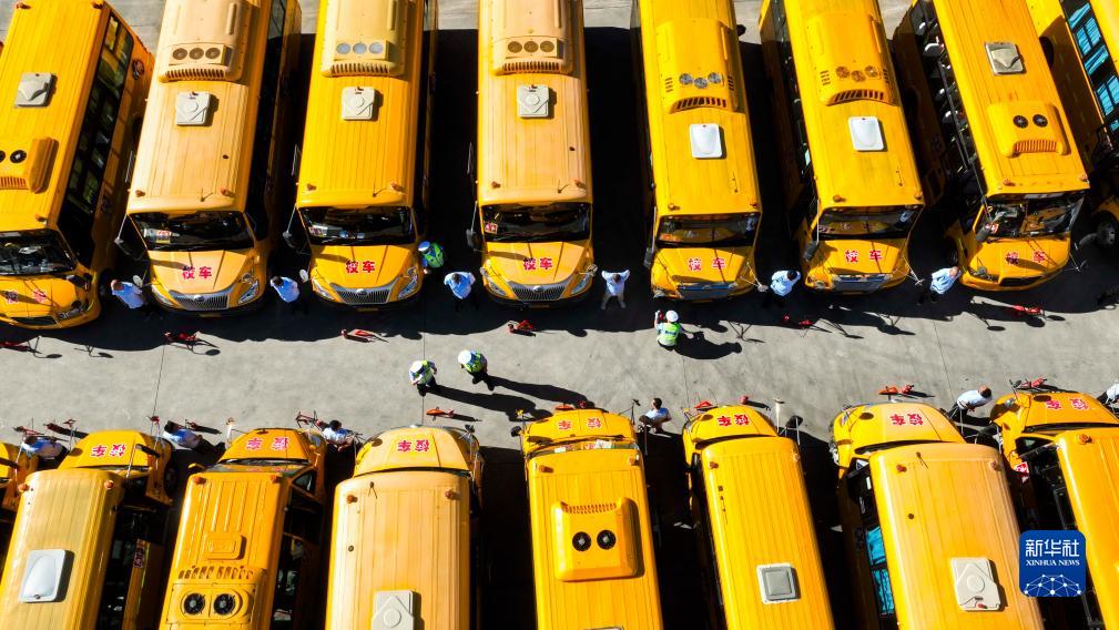 8月22日,民警在河北省遵化市一車輛檢測場檢查校車(無人機照片)。