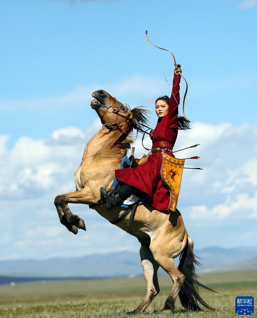 8月19日,在蒙古國泰吉山谷,一名女選手在蒙古國“游牧民族”世界文化節(jié)上展示騎馬射箭。