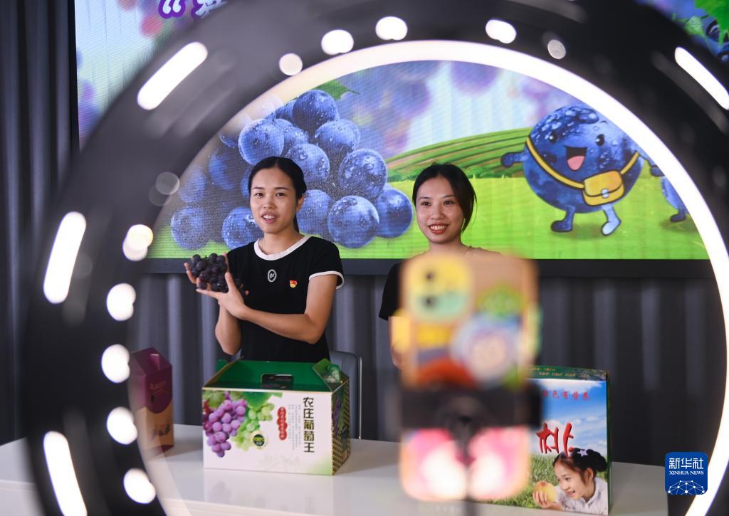 8月22日,黨員志愿者在嘉興市南湖區電商產業園的共富工坊直播間進行葡萄助農直播銷售。