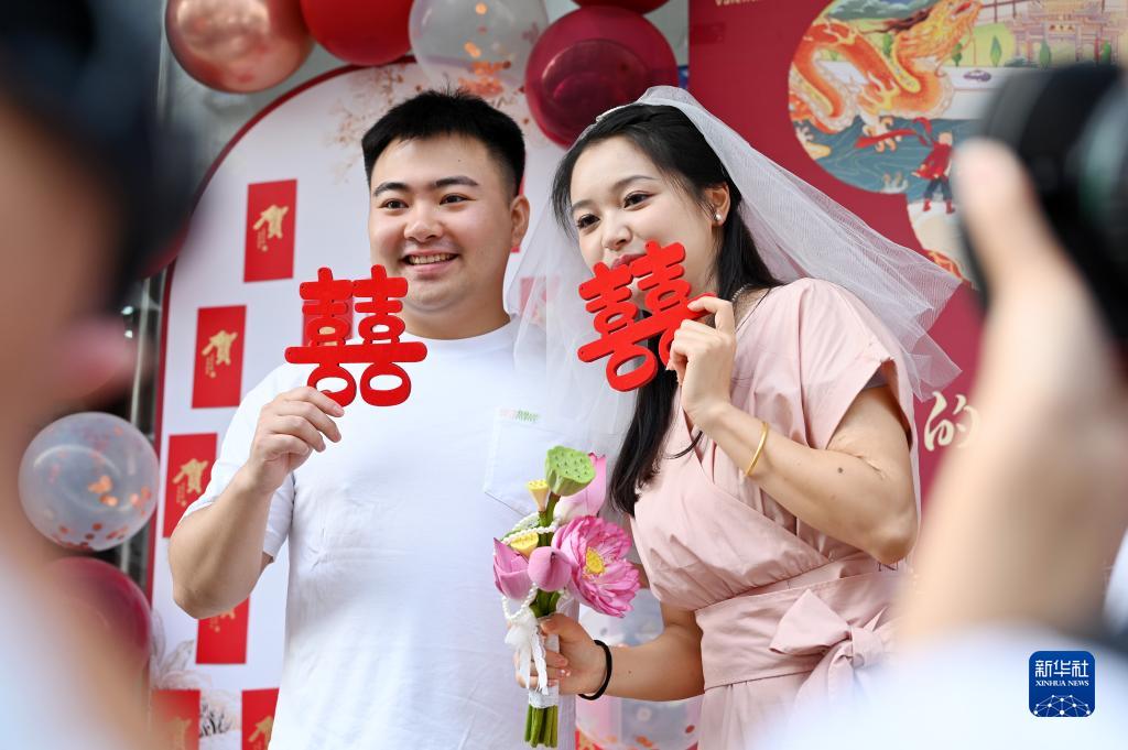 8月22日,一對新人在四川省內江市東興區民政局婚姻登記處拍照留念。