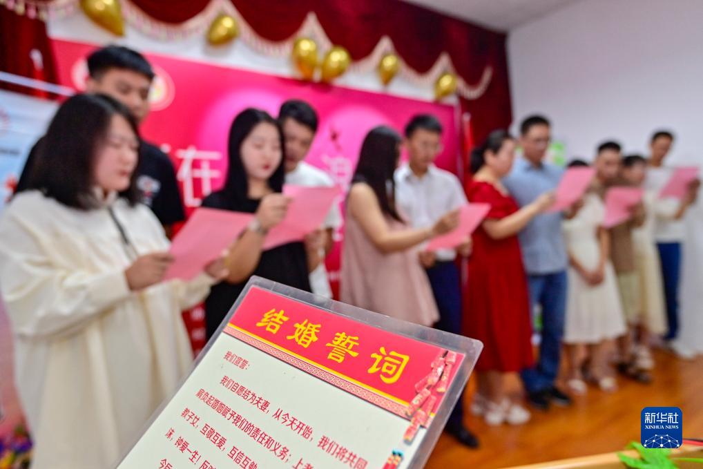 8月22日,新人在山東省青州市政務(wù)服務(wù)中心民政局婚姻登記處宣讀結(jié)婚誓詞。
