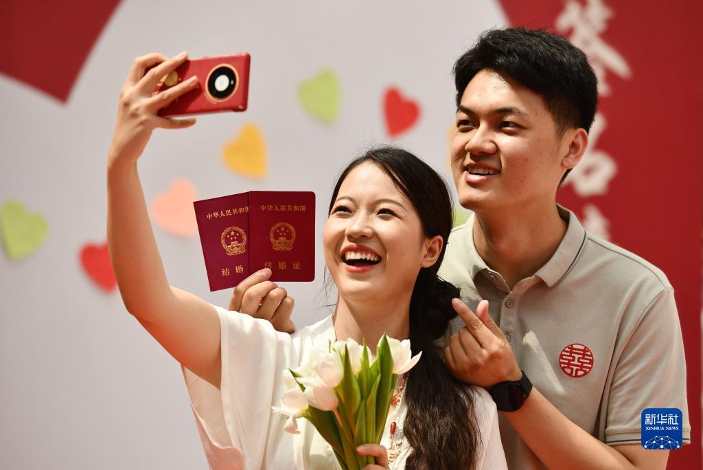 8月22日,在安徽省阜陽(yáng)市舉辦的“愛(ài)在七夕 美好阜陽(yáng)幸福家”婚姻登記集體頒證暨“最美家庭”第一課活動(dòng)現(xiàn)場(chǎng),新人在拍照留影。