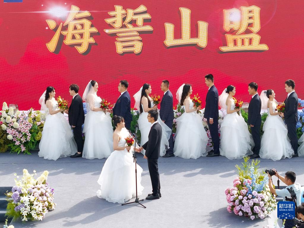 8月22日,新人們在山東青島金沙灘啤酒城“愛情海灣”參加集體婚禮(無人機照片)。