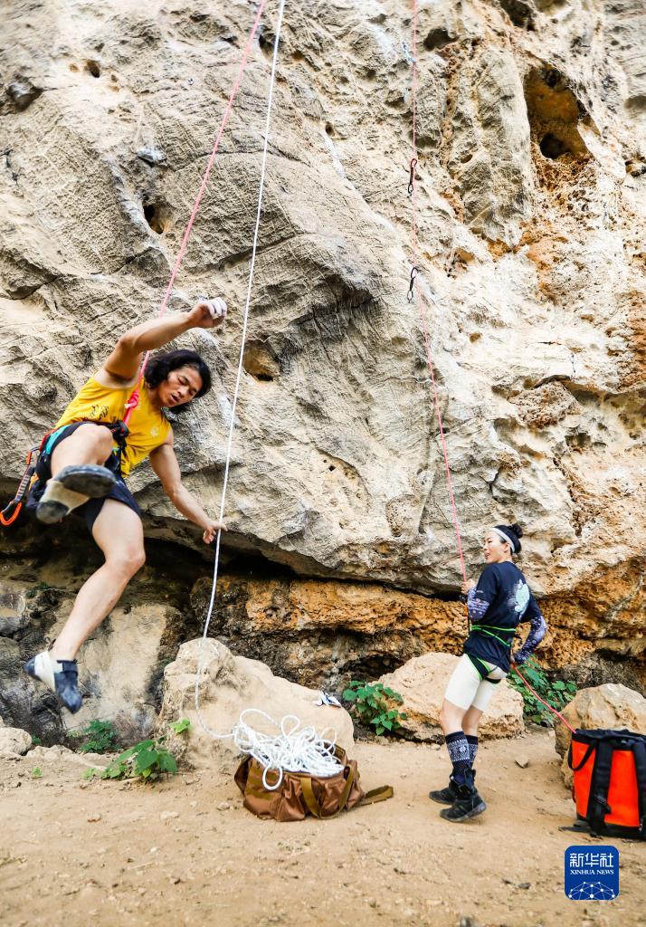 肖婷(右)對劉永邦進行攀巖保護(2023年5月6日攝)。