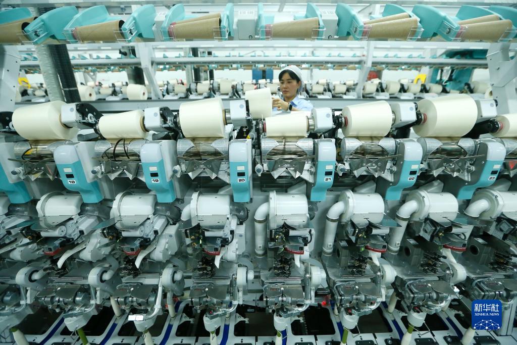 8月22日,青島即發(fā)盛寶紡織有限公司工人在數(shù)字化紡紗智能生產(chǎn)線上生產(chǎn)高端纖維。