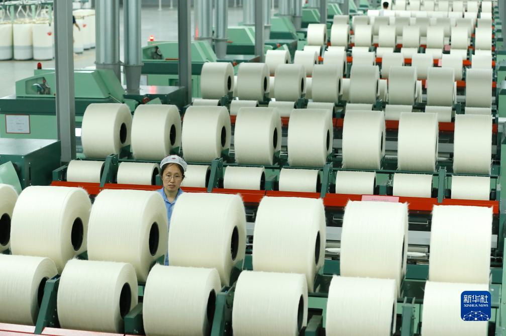 8月22日,青島即發(fā)盛寶紡織有限公司工人在數(shù)字化紡紗智能生產(chǎn)線上生產(chǎn)高端纖維。