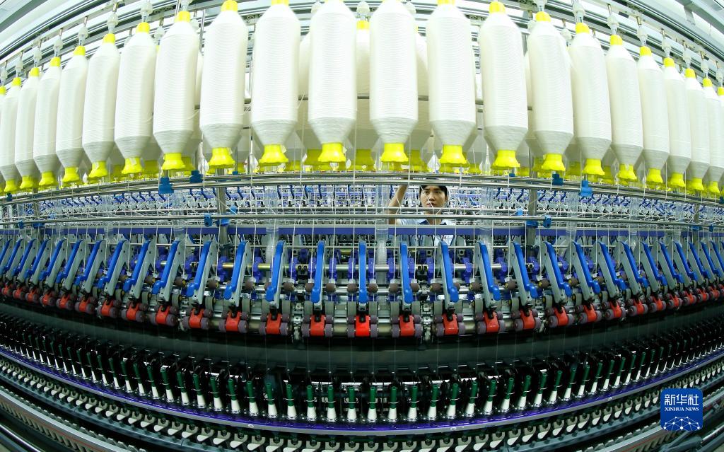 8月22日,青島即發盛寶紡織有限公司工人在數字化紡紗智能生產線上生產高端纖維。