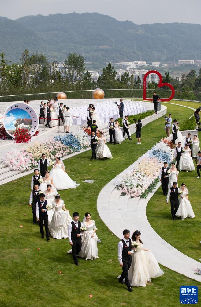 當日是七夕,來自四川省宜賓市三江新區33對新人在三江新區“三江之眼”舉辦了“為愛奔赴·幸福三江”主題集體婚禮。