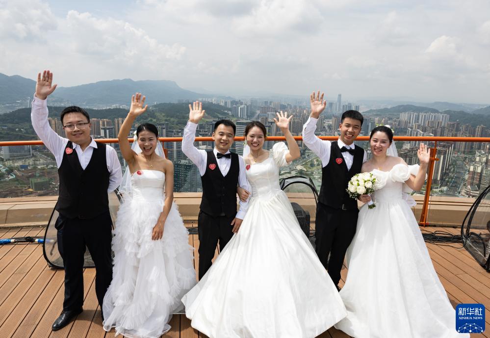 8月22日,參加集體婚禮的新人在三江新區(qū)“三江之眼”520觀景平臺合影留念。