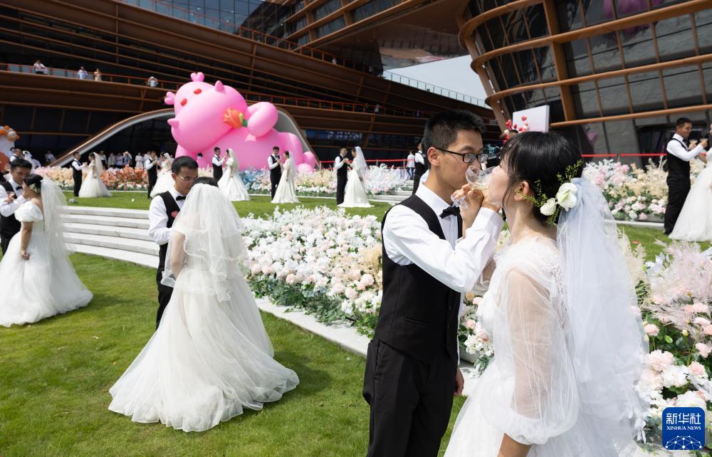 8月22日,新人在三江新區“三江之眼”舉行集體婚禮時喝交杯酒。