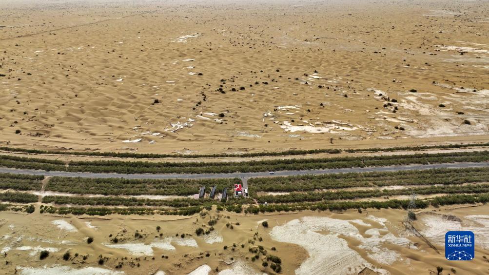 在位于新疆的塔克拉瑪干沙漠腹地,中國首條貫穿塔克拉瑪干沙漠的等級公路——塔里木零碳沙漠公路,像一條綠色長龍蜿蜒曲折,在沙漠深處延伸。